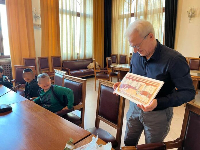 Τα παιδιά της Δ’ Τάξης του 4ου Δημοτικού Σχολείου μαζί με τις εκπαιδευτικούς τους, υποδέχθηκε με χαρά ο Δήμαρχος Ηρακλείου Αλέξης Καλοκαιρινός και η Αντιδήμαρχος Εθελοντισμού Φιλαρέτη Δαφέρμου – Χρονάκη στην αίθουσα «Ελευθέριος Βενιζέλος» στη Λότζια, το πρωί της Τετάρτης 26/11.