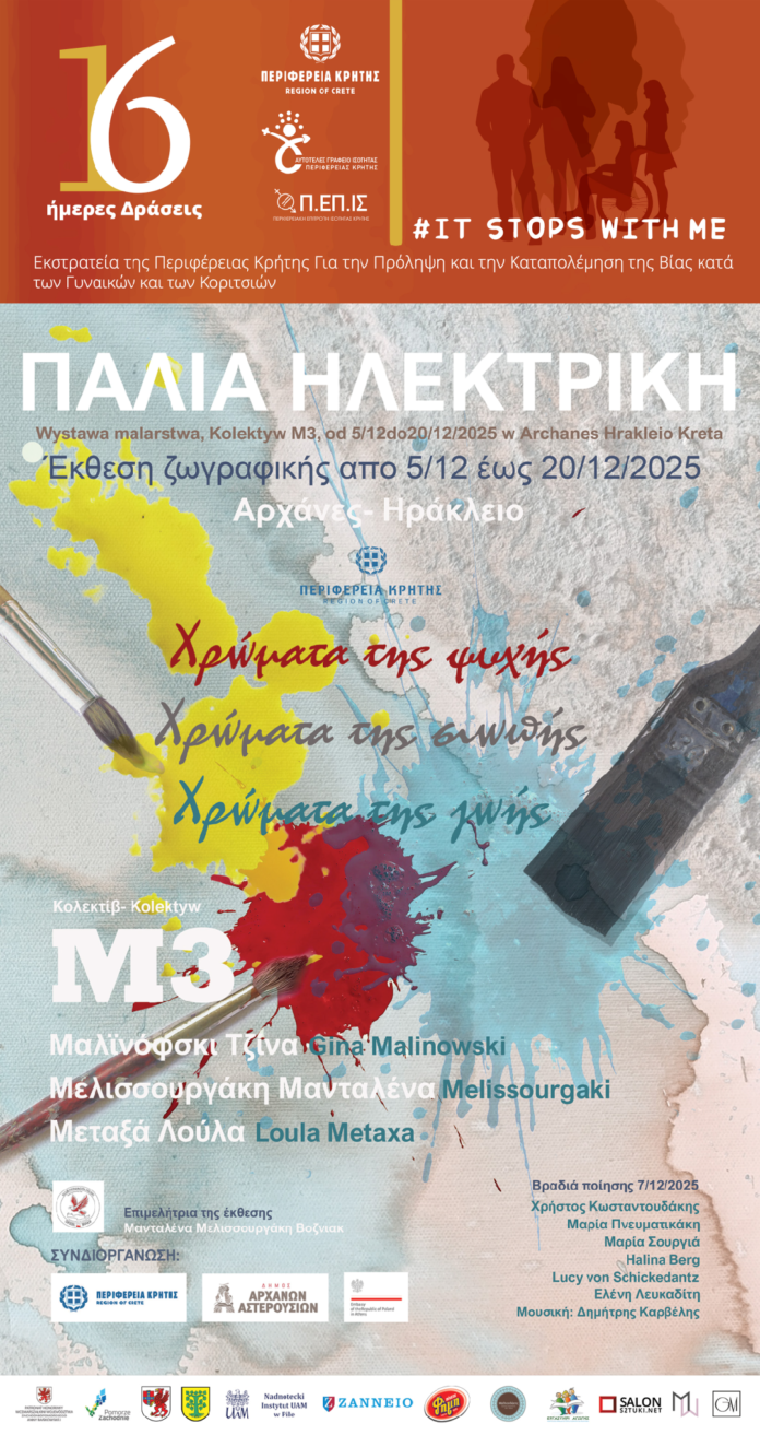 Η Κολεκτίβ Μ3 αποτελεί μια δυναμική συνένωση τριών εικαστικών καλλιτέχνηδων από δύο χώρες και διαφορετικές γενιές, που πραγματοποιείται στο πλαίσιο της συνεργασίας Πολωνίας-Ελλάδας. Πρόκειται για μία τριπλή παρουσίαση που εξερευνά τον κόσμο των χρωμάτων μέσα από τρεις διακριτές, αλλά στενά συνδεδεμένες ενότητες. Η Έκθεση Ζωγραφικής: “Χρώματα της Ψυχής, Χρώματα της Σιωπής, Χρώματα της Ζωής”, θα πραγματοποιηθεί στο πλαίσιο των16ήμερων Δράσεων της Περιφέρειας Κρήτης για την Πρόληψη και την Αντιμετώπιση της Βίας κατά των Γυναικών και των Κοριτσιών, από τις 5 έως τις 20 Δεκεμβρίου 2025, στην Παλιά Ηλεκτρική στις Αρχάνες, με ελεύθερη είσοδο. Τα εγκαίνια της Έκθεσης θα γίνουν την Κυριακή 7 Δεκεμβρίου και ώρα 5:00μ.μ. Η επιμέλεια της Έκθεσης έχει πραγματοποιηθεί από την Μανταλένα Μελισσουργάκη-Βόσνιακ.