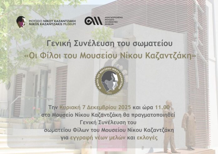 Η Γενική Συνέλευση ορίστηκε στις 7 Δεκεμβρίου 2025, ώρα 11.00 και θα πραγματοποιηθεί στην Αίθουσα «Γ. Ανεμογιάννης» του Μουσείου Νίκου Καζαντζάκη στη Μυρτιά. Θα πραγματοποιηθούν εγγραφές νέων μελών και θα διενεργηθούν οι εκλογές.
