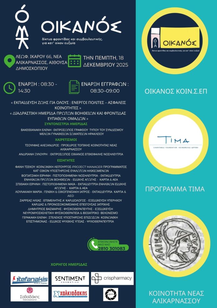 Η Δημοτική Κοινότητα Νέας Αλικαρνασσού σε συνεργασία με την ΟΙΚΑΝΟΣ ΚΟΙΝ.Σ.ΕΠ. και το Κοινωφελές Ίδρυμα ΤΙΜΑ, διοργανώνει τη Διαδραστική Ημερίδα Πρώτων Βοηθειών και Φροντίδας Ευάλωτων Ομάδων, με τίτλο