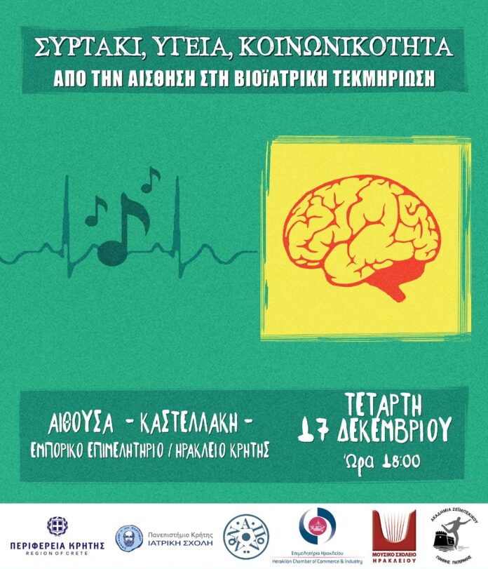 Στο πλαίσιο του «Αφιερωματικού Έτους Μίκη Θεοδωράκη 2025», η Περιφέρεια Κρήτης και η Ιατρική Σχολή του Πανεπιστημίου Κρήτης διοργανώνουν μια ιδιαίτερη εκδήλωση που συνδυάζει επιστήμη, πολιτισμό και παράδοση. Η εκδήλωση θα πραγματοποιηθεί την Τετάρτη 17 Δεκεμβρίου, στις 18:00, στην αίθουσα «Καστελλάκη» του Εμπορικού Επιμελητηρίου Ηρακλείου.
