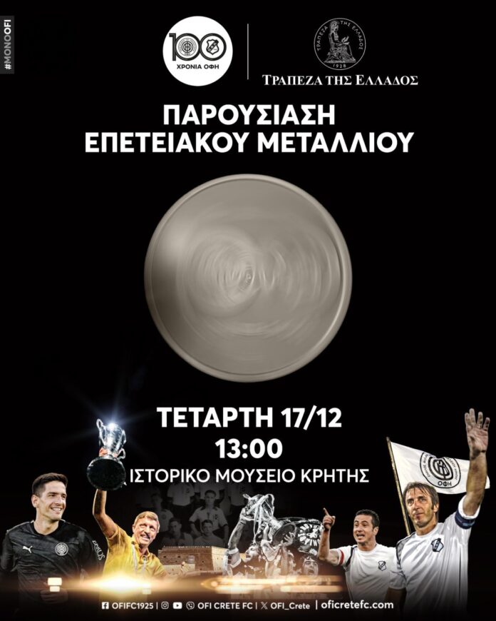 στις 13:00 στο Ιστορικό Μουσείο Κρήτης η ΠΑΕ ΟΦΗ θα πραγματοποιήσει την επίσημη παρουσίαση του Επετειακού Μεταλλίου των 100 χρόνων από την ίδρυση του συλλόγου.
