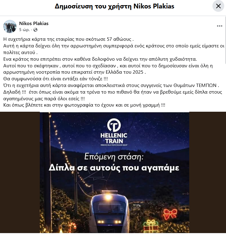 Με έντονο ύφος αντέδρασε ο Νίκος Πλακιάς σε μία ευχετήρια κάρτα που δημοσίευσε η Hellenic Train για τις ημέρες των γιορτών.