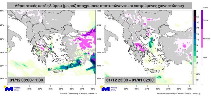 Στην παρακάτω ομάδα χαρτών παρουσιάζεται ο αθροιστικός υετός 3ώρου για τις 8:00 – 11:00 της Τετάρτης 31/12 και 23:00 της Τετάρτης 31/12 – 2:00 της Πέμπτης 1/1, καθώς και η εκτιμώμενη αθροιστική χιονόστρωση στην Ανατολική Στερεά και στην Αττική έως και το βράδυ της Πέμπτης 1/1.