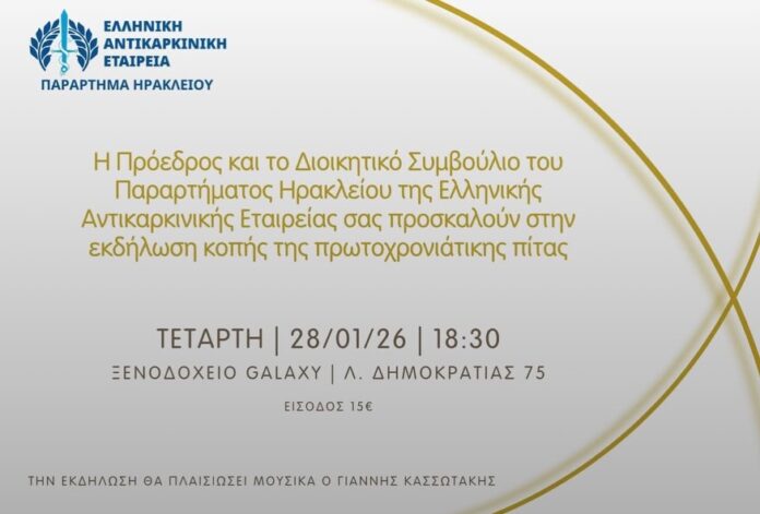 Το Παράρτημα Ηρακλείου της Ελληνικής Αντικαρκινικής Εταιρείας (ΕΑΕ) σας προσκαλεί στην εκδήλωση κοπής της πρωτοχρονιάτικης βασιλόπιτας, που θα πραγματοποιηθεί την Τετάρτη 28 Ιανουαρίου 2026 και ώρα 18:30, στο Ξενοδοχείο Galaxy (Λεωφ. Δημοκρατίας 75).