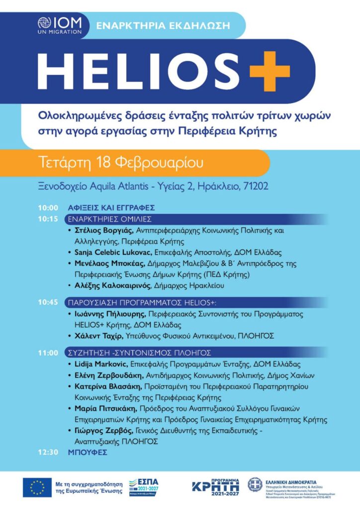 O Διεθνής Οργανισμός Μετανάστευσης σάς προσκαλεί στην εκδήλωση που θα πραγματοποιηθεί σχετικά με την υλοποίηση του Προγράμματος HELIOS+ στην Περιφέρεια Κρήτης.