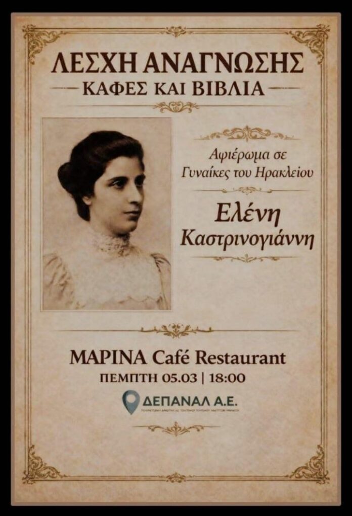 Με ένα «Αφιέρωμα σε γυναίκες του Ηρακλείου» συνεχίζεται η Λέσχη Ανάγνωσης «Καφές και Βιβλία» στο Μαρίνα Café Restaurant.