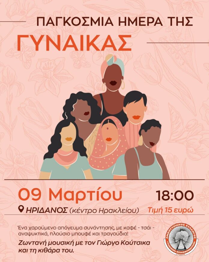Με αφορμή την Παγκόσμια Ημέρα Γυναίκας, ο Αναπτυξιακός Σύλλογος Γυναικών Επιχειρηματιών Κρήτης, διοργανώνει μια ξεχωριστή εκδήλωση με ζωντανή μουσική, τη Δευτέρα 9 Μαρτίου 6μμ στον καφέ Ηριδανός (οδ. Ανδόγεω Ηράκλειο)