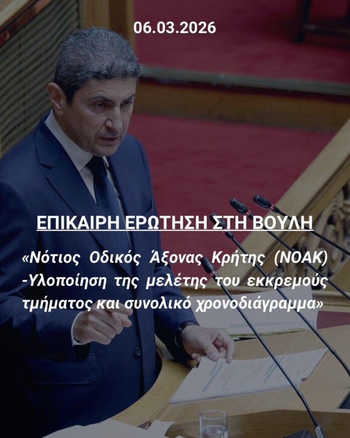 Επίκαιρη ερώτηση προς τον Υπουργό Υποδομών και Μεταφορών, κ. Χρίστο Δήμα, κατέθεσε ο πρ. Υπουργός και Βουλευτής Ηρακλείου, Λευτέρης Αυγενάκης, σχετικά με την πορεία ωρίμανσης και το συνολικό χρονοδιάγραμμα υλοποίησης του Νότιου Οδικού Άξονα Κρήτης (ΝΟΑΚ), ενός έργου κρίσιμης σημασίας για τη συνδεσιμότητα και την αναπτυξιακή προοπτική της νότιας Κρήτης.