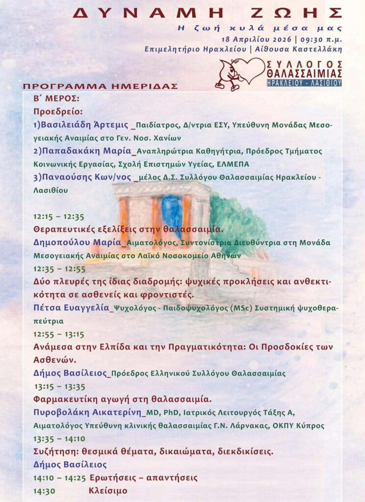 Με στόχο την ενημέρωση, την ευαισθητοποίηση και την ενίσχυση της υποστήριξης προς τα άτομα με θαλασσαιμία, πραγματοποιείται το Σάββατο 18 Απριλίου 2026 στο Ηράκλειο η ημερίδα με τίτλο «Δύναμη Ζωής – Η ζωή κυλά μέσα μας». Η εκδήλωση διοργανώνεται από τον Σύλλογο Θαλασσαιμίας Ηρακλείου – Λασιθίου και φιλοξενείται στην αίθουσα Καστελλάκη του Επιμελητηρίου Ηρακλείου, με έναρξη στις 09:30 π.μ.