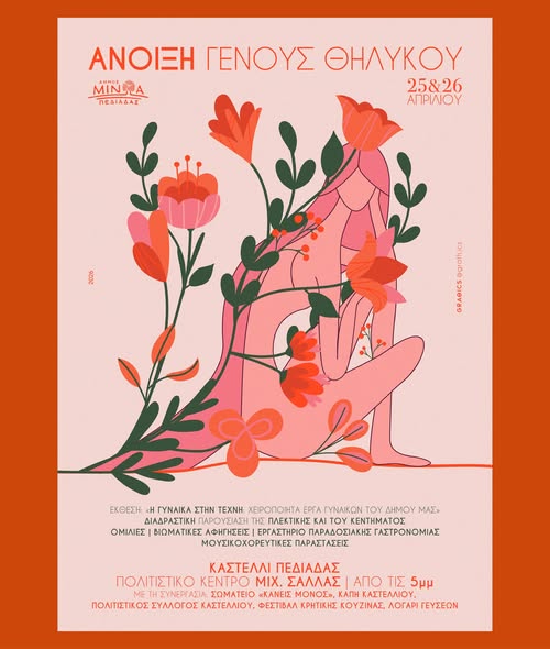 Ο Δήμος Μινώα Πεδιάδας, τιμώντας τη Γυναίκα, την Τέχνη και την Παράδοση, διοργανώνει διήμερο εκδηλώσεων με τίτλο «ΑΝΟΙΞΗ ΓΕΝΟΥΣ ΘΗΛΥΚΟΥ». Οι εκδηλώσεις θα πραγματοποιηθούν το Σάββατο 25 και την Κυριακή 26 Απριλίου 2026, στο Πολιτιστικό Κέντρο «Μιχάλης Σάλλας» στο Καστέλλι του Δήμου Μινώα Πεδιάδας, στις 5:00 μ.μ