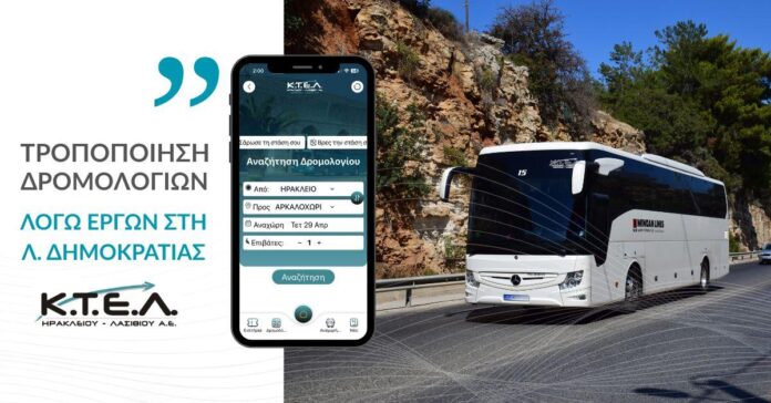 Η ΚΤΕΛ Ηρακλείου Λασιθίου AE ενημερώνει το επιβατικό κοινό ότι, λόγω εκτέλεσης έργων, η Λεωφόρος Δημοκρατίας (ρεύμα ανόδου) θα παραμείνει κλειστή από 29 Απριλίου και μέχρι νεωτέρας.